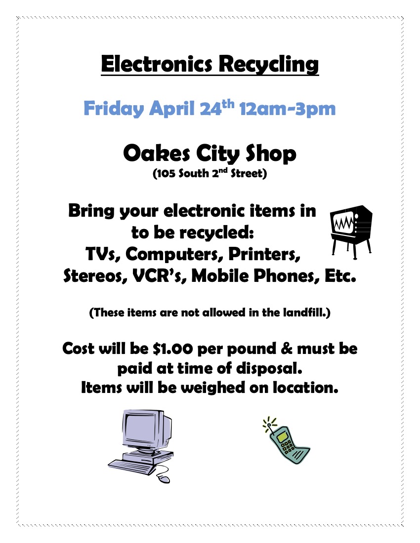 Electronics Recycling will be held Friday, April 24th from 12am-3pm.