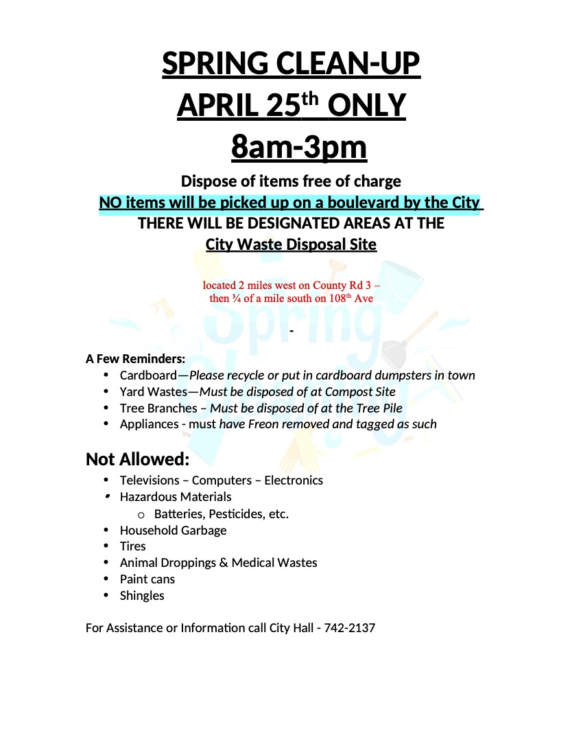 Spring Clean-Up will be held April 25th from 8am-3pm.
